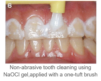 The gel should be applied to each tooth surface for 20-30 seconds (up to 1 minute for stubborn stains), taking care to avoid gum contact, using a one-tuft brush or similar hand instrument, and treating only several teeth at a time. If mechanical cleaning is unavoidable, a prophy paste with the lowest possible RDA abrasiveness is advised.
